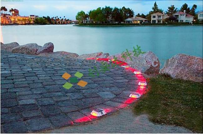 白天太陽(yáng)能電池板吸收太陽(yáng)光,把太陽(yáng)能轉(zhuǎn)化成電能, 儲(chǔ)存在儲(chǔ)能器件(電池或電容)中,到了晚上,儲(chǔ)能器件中的電能自動(dòng)轉(zhuǎn)化成光能(通過(guò)光電開關(guān)控制),通過(guò)LED發(fā)出亮光來(lái)勾畫道路輪廓,誘導(dǎo)駕駛員視線。