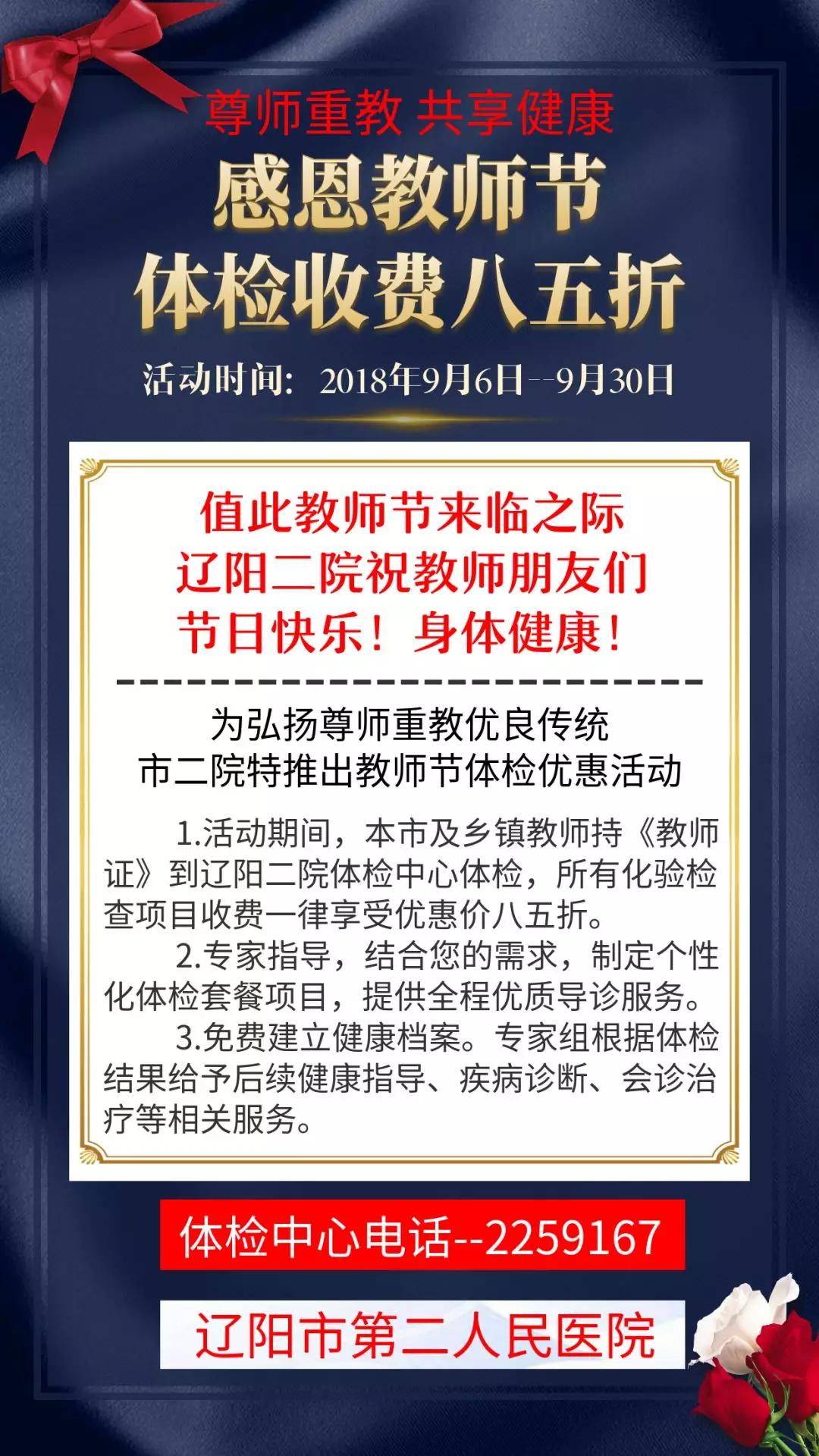 值此教師節(jié)來臨之際,遼陽市第二人民醫(yī)院祝教師朋友們節(jié)日快樂!身體健康!尊師重教是中華民族的優(yōu)良傳統(tǒng),為感恩、回饋老師們辛勤的工作,醫(yī)院特推出體檢優(yōu)惠月活動。