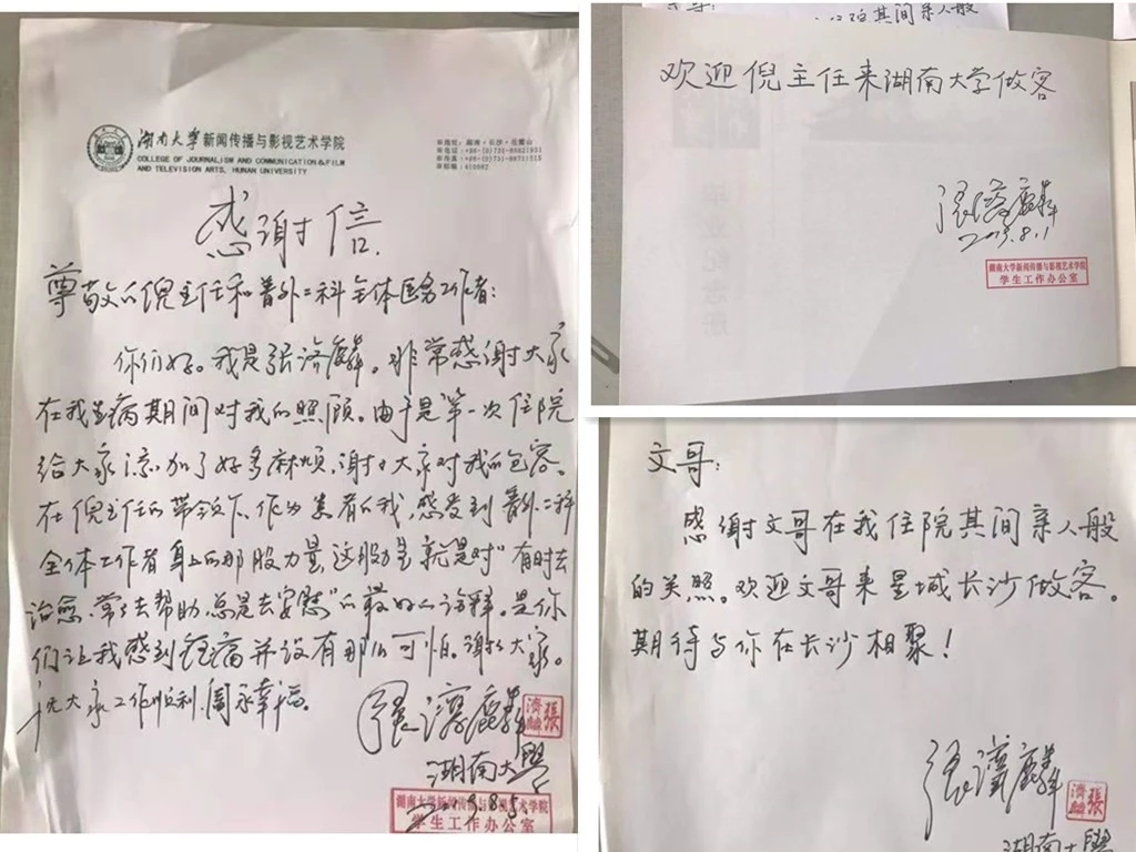 8月9日,普外科二病房收到了一封遠(yuǎn)方來信,寄信人是湖南大學(xué)的研究生、留校導(dǎo)員張濟(jì)麟。