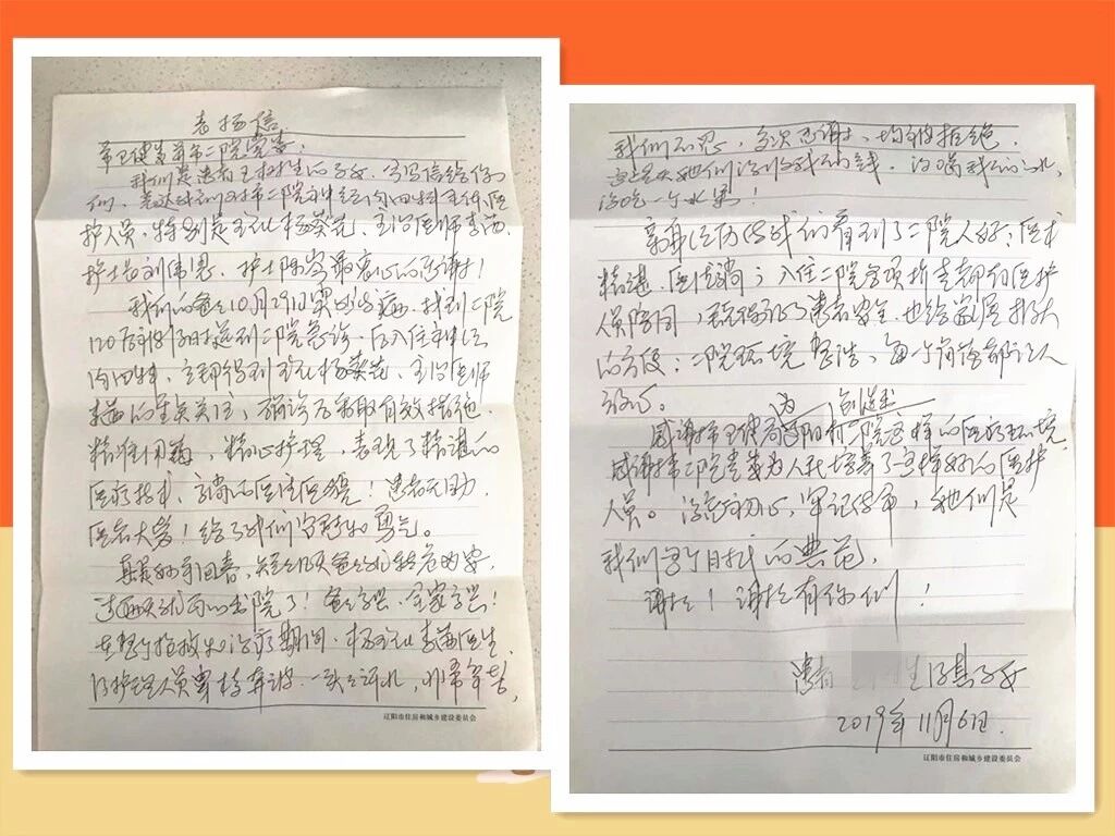我們是患者王某的子女,今寫信給你們,表達(dá)我們對(duì)市二院神經(jīng)內(nèi)四科全體醫(yī)護(hù)人員,特別是主任楊葵花、主治醫(yī)師李茜、護(hù)士長劉偉思、護(hù)士陳岑最衷心的感謝!