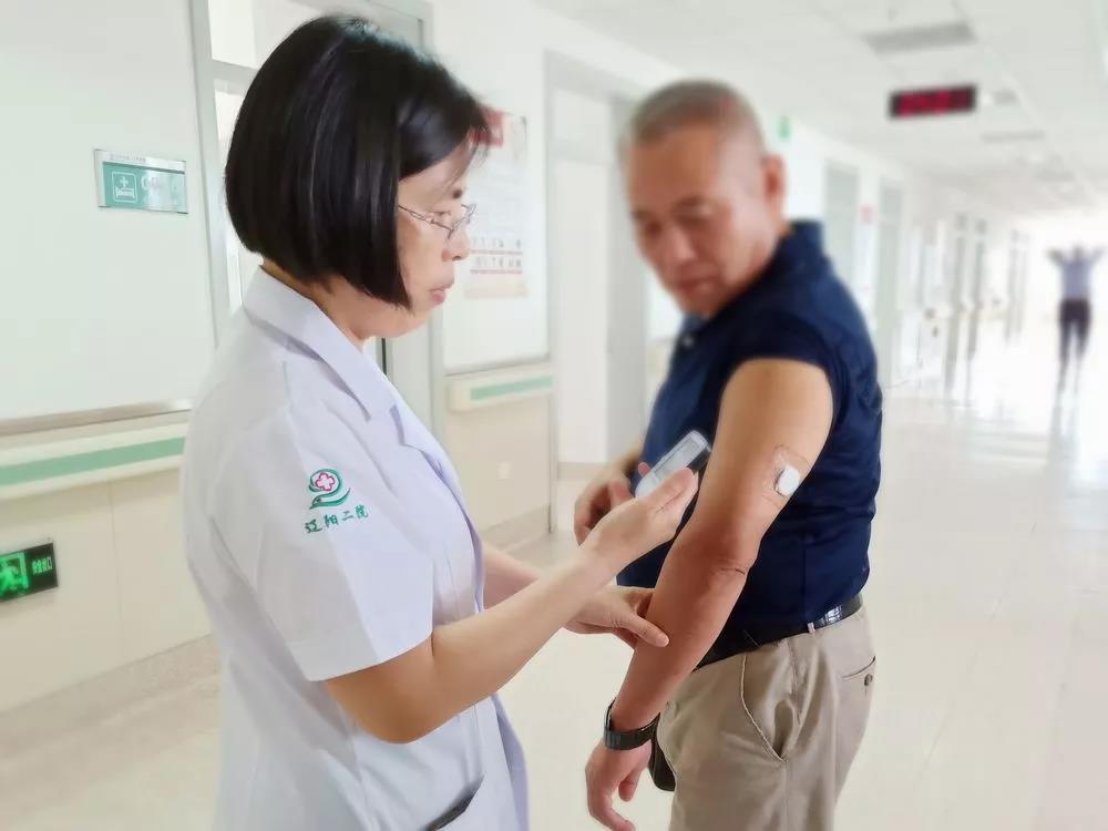 近期,我院內(nèi)分泌二科引進了一款高端、便捷的動態(tài)血糖監(jiān)測儀,患者于上臂內(nèi)側(cè)貼上芯片,醫(yī)護人員用主機掃一掃便可上傳血糖值。該設(shè)備有獨特的防水設(shè)計及圖譜顯示,芯片可以連續(xù)佩戴14天。
