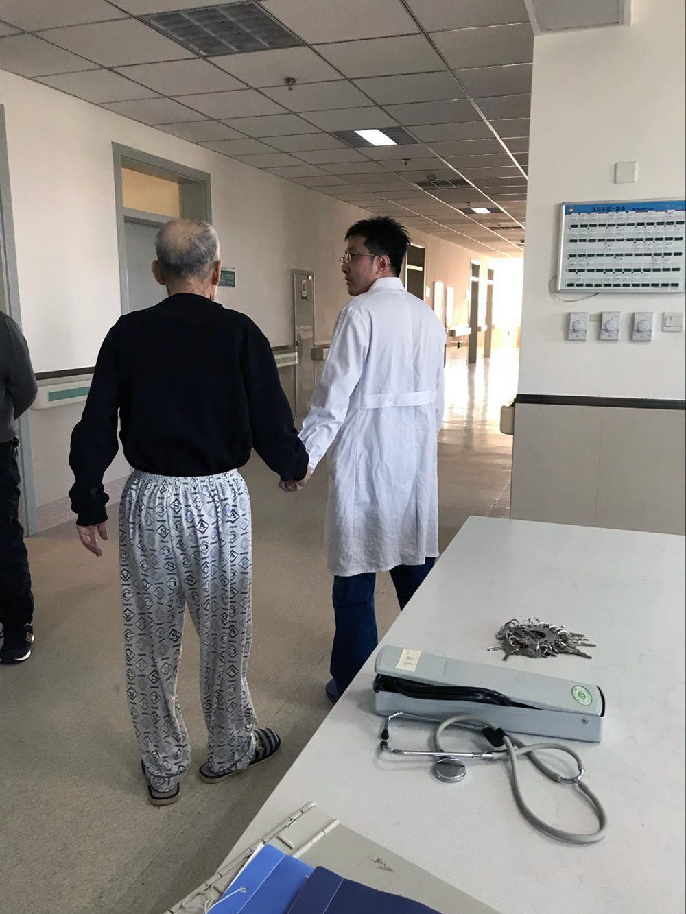 我科有一位特別的患者,一位總和醫(yī)護(hù)人員牽手的患者。老人81歲了有些糊涂經(jīng)常打兒子罵陪護(hù),總是到辦公室來找大夫,每天當(dāng)班的醫(yī)生不同卻從沒有人拒絕過老人。抓拍到的分別是我科肖東,夏文兩名醫(yī)生,正在送老人回病房。老人緊緊的攥著醫(yī)生的手,他分不清誰是誰,只是他認(rèn)這身白大衣,相信這穿白大衣的人。